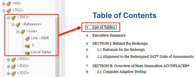 <TOC> | +-- <TOCI> | | | +-- <Reference> | | | +-- <Link> | | | +-- Tag: Link - OBJR | +-- TOC item label (untagged content node) | +-- TOC item leader (untagged content node) | +-- TOC item page number (untagged content node) +-- <TOCI> |