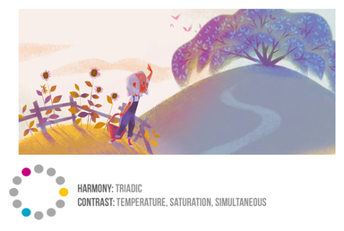 a super helpful exercise is to look at your favorite illustrations, paintings, photographs, designs, etc and assess which one of the 8 color schemes (linked above) it has, and which types (can be more than one) of contrast it has. we did this in school and it REALLY helped me look at color better. here’s part of the assignment i did, the artist is annette marnat.