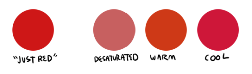 this comes into play because a big mistake i see beginners make is that they pick a “just” color, and by that i mean they pick “just blue” or “just yellow”. imagine buying a set of oil paints and only using paints straight from the tube without ever mixing. it would be impossible! so i try to avoid picking “just” colors, except as for a complementary color (more on that in a bit). here are some variations of a red, for example.