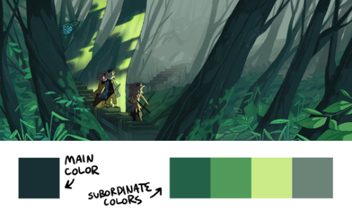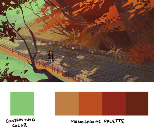 i usually use an analogous palette or monochrome palette out of preference. the two examples above more or less fall into those categories. however, i also like to use split complementary because the complimentary color adds a LOT of contrast and visual interest. it’s great to use if you have a specific thing in a painting you want to draw attention to. here’s an example: