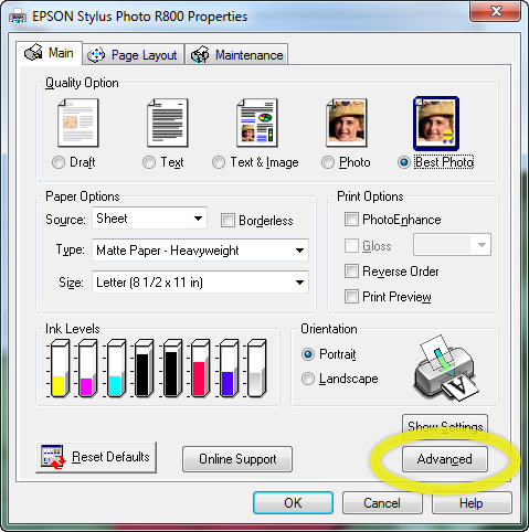 • Click the Printer... button to select the Epson R800 printer access the its properties