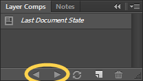 - To cycle through the different rollover states click the right and left arrow icons at the bottom of the Layer Comp panel.