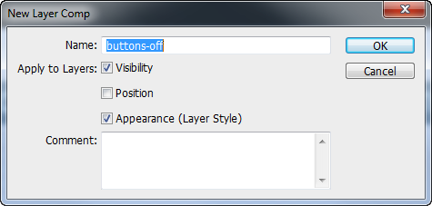 - Click the appropriate Layer Comp in the Layer Comps panel. This will load that set of button states.