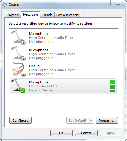 - With USB Audio CODEC selected, click Properties