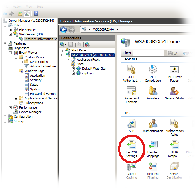The next step is to configure the FastCGI Application on IIS. FastCGI is available whenever you have installed the CGI feature on your IIS installation. Run the server manager and go to the IIS role and configuration. Select your website. You should see a FastCGI Settings icon: