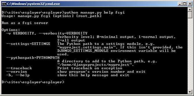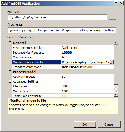 Arguments, enter the command line for running our fcgi command, i.e.d:\sites\esplayer\esplayer\manage.py fcgi --pythonpath=d:\sites\esplayer --settings=esplayer.settings