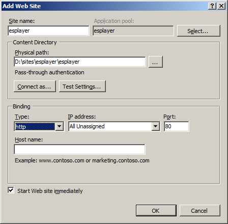 In our example, the Django project will be named esplayer and will be installed in d:\sites\esplayer. Please note that this configuration has been tested on Windows 2008 Server R2.