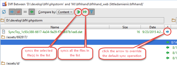After reviewing the files that differ, either click the single arrow to sync a single file, or the double arrows to sync all the files in the list.